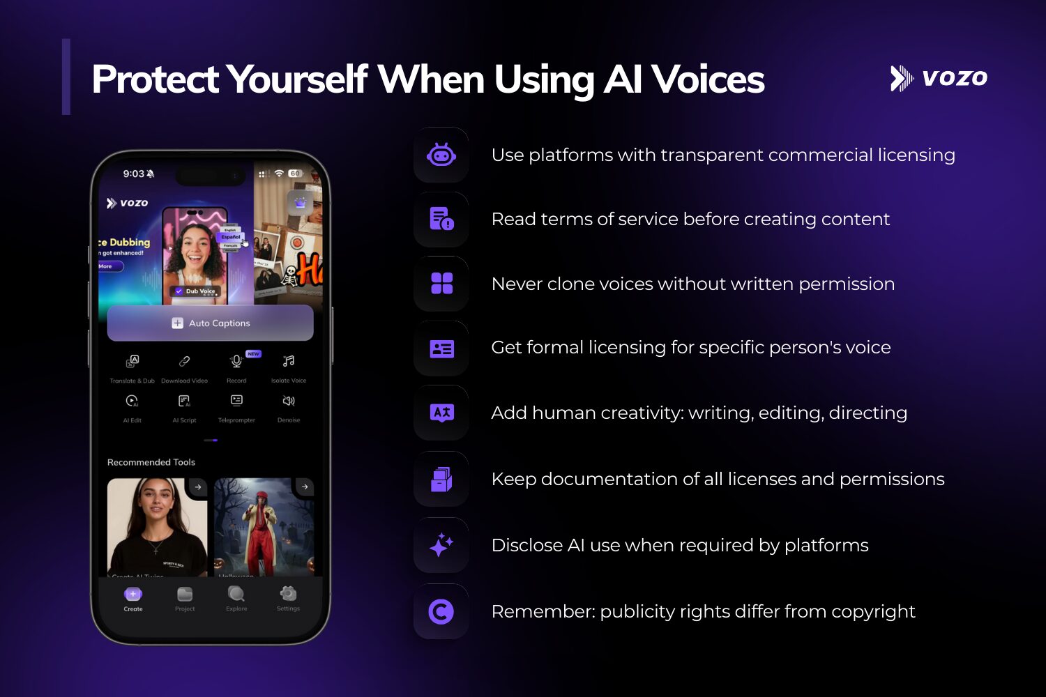 A platform like Vozo AI uses licensed voice models for our dubbing and translation services across 60+ languages, ensuring voice data comes from consented sources rather than unauthorized scraping. This licensing structure protects creators using our platform from training data litigation and right of publicity claims affecting other AI voice providers.