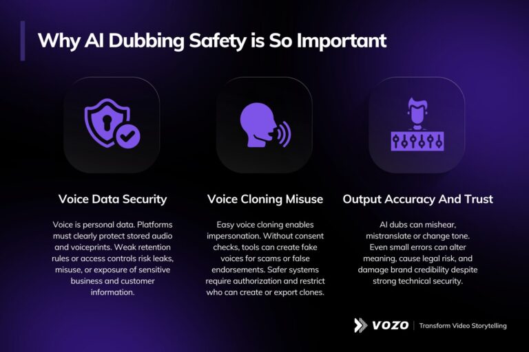 When creators ask, “Is dubbing AI safe to use?” they’re usually responding to real risks that affect both individuals and organizations. AI dubbing doesn’t just change audio. It processes identity-linked voice data, can be used to imitate real people and can also introduce errors that damage trust once the content goes live.