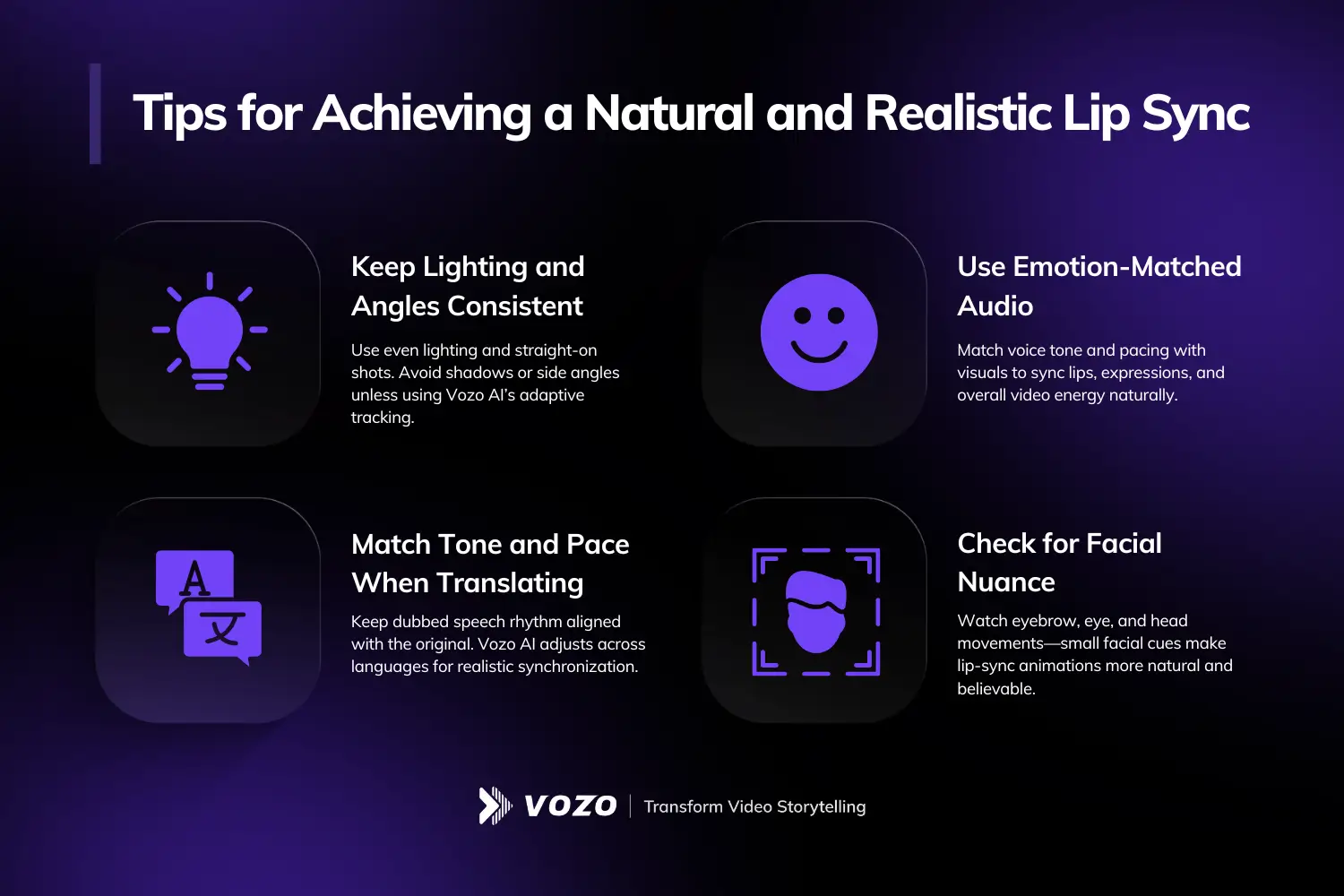 - Match tone and pace when translating: For video translation, make sure your dubbed speech matches the rhythm of the original talking. Vozo’s lip sync tool is designed to adjust across language or dialect, but realistic pacing still makes a big difference.