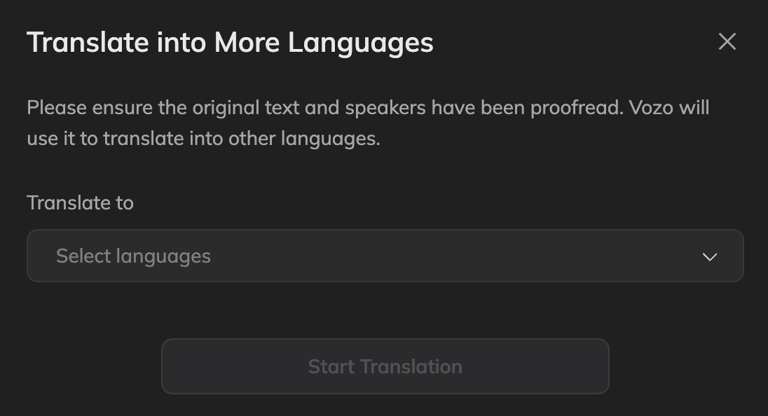 Once this primary base is perfect, you can select additional target languages. Vozo efficiently utilizes the edited transcript and base timing to generate all selected versions in one efficient batch. This guarantees consistency in transcription, speaker tags, and timing across multiple projects, eliminating the necessity of repeating meticulous proofreading steps for every language.