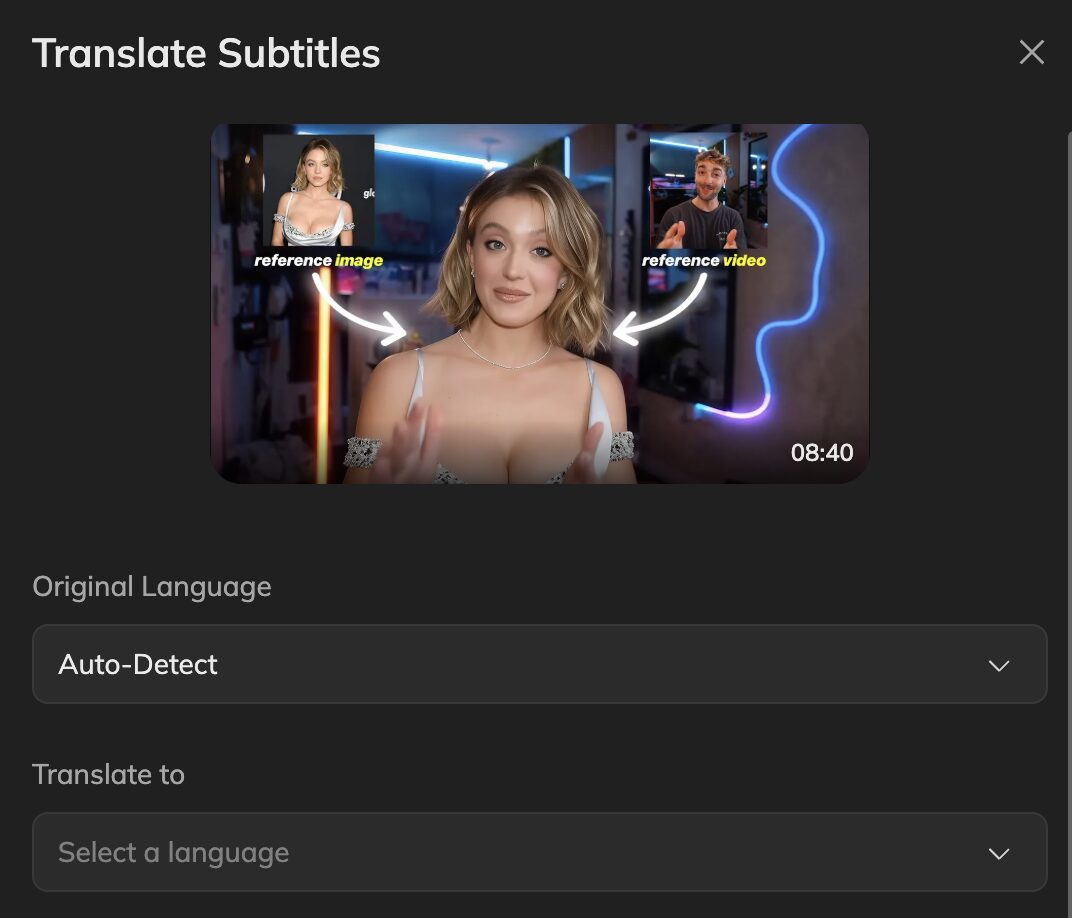 - Auto Transcribe + Translate: The AI instantly transcribes the audio, translates the text, and aligns the result with the video.