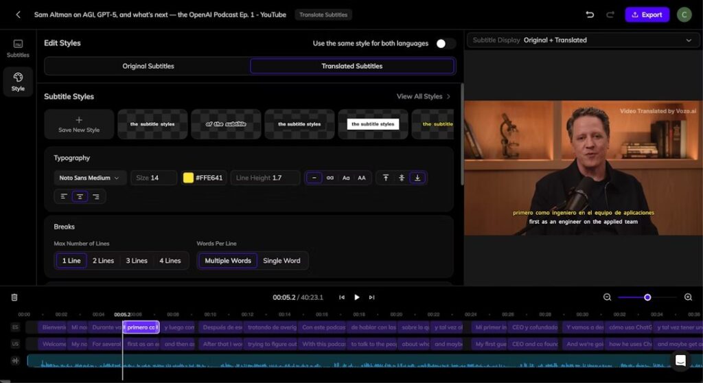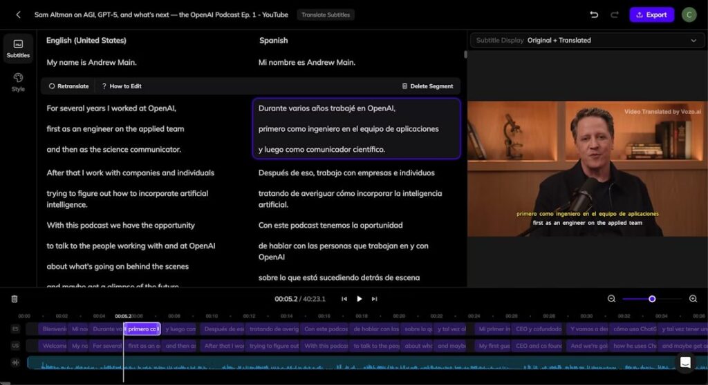 Once your translation is complete, you can review and refine subtitles directly in Vozo’s Subtitle Editor. The editor provides full control over both source and translated text, ensuring accuracy, readability, and alignment with your video.