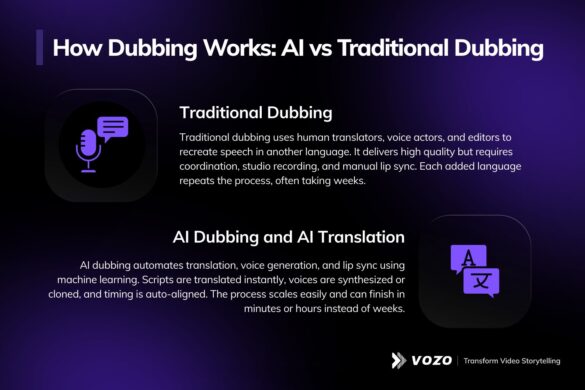 El doblaje tradicional se basa en un proceso totalmente humano. Un traductor o un equipo de lingüistas traduce el guión a la lengua de destino. Una vez aprobado, actores de doblaje cualificados graban una voz en off en un estudio. A continuación, los editores ajustan manualmente la sincronización y los movimientos de los labios para que coincidan con los del locutor en pantalla.