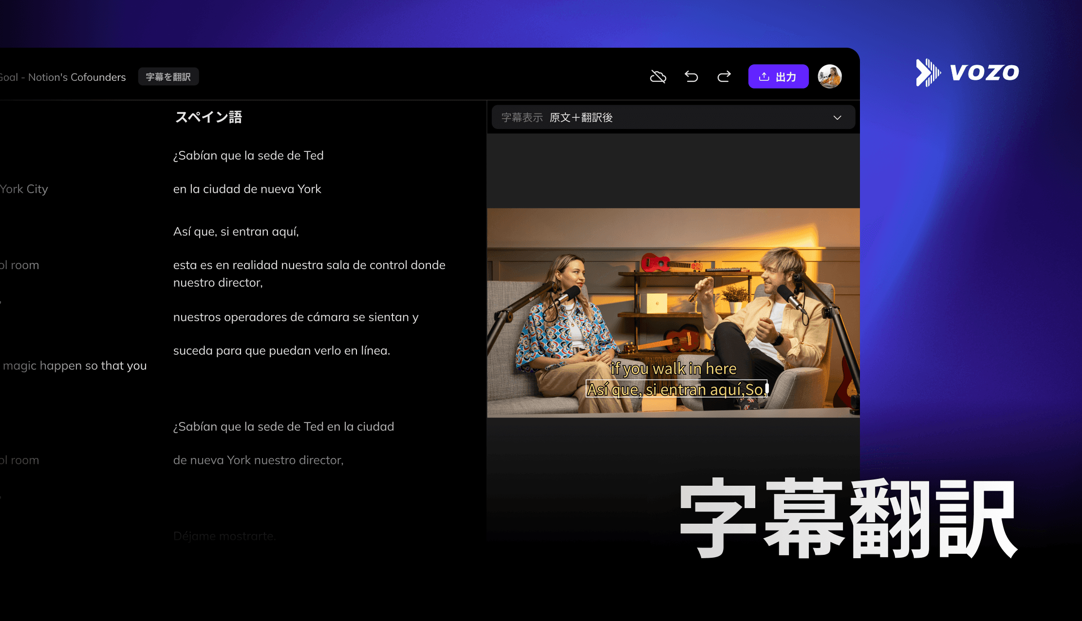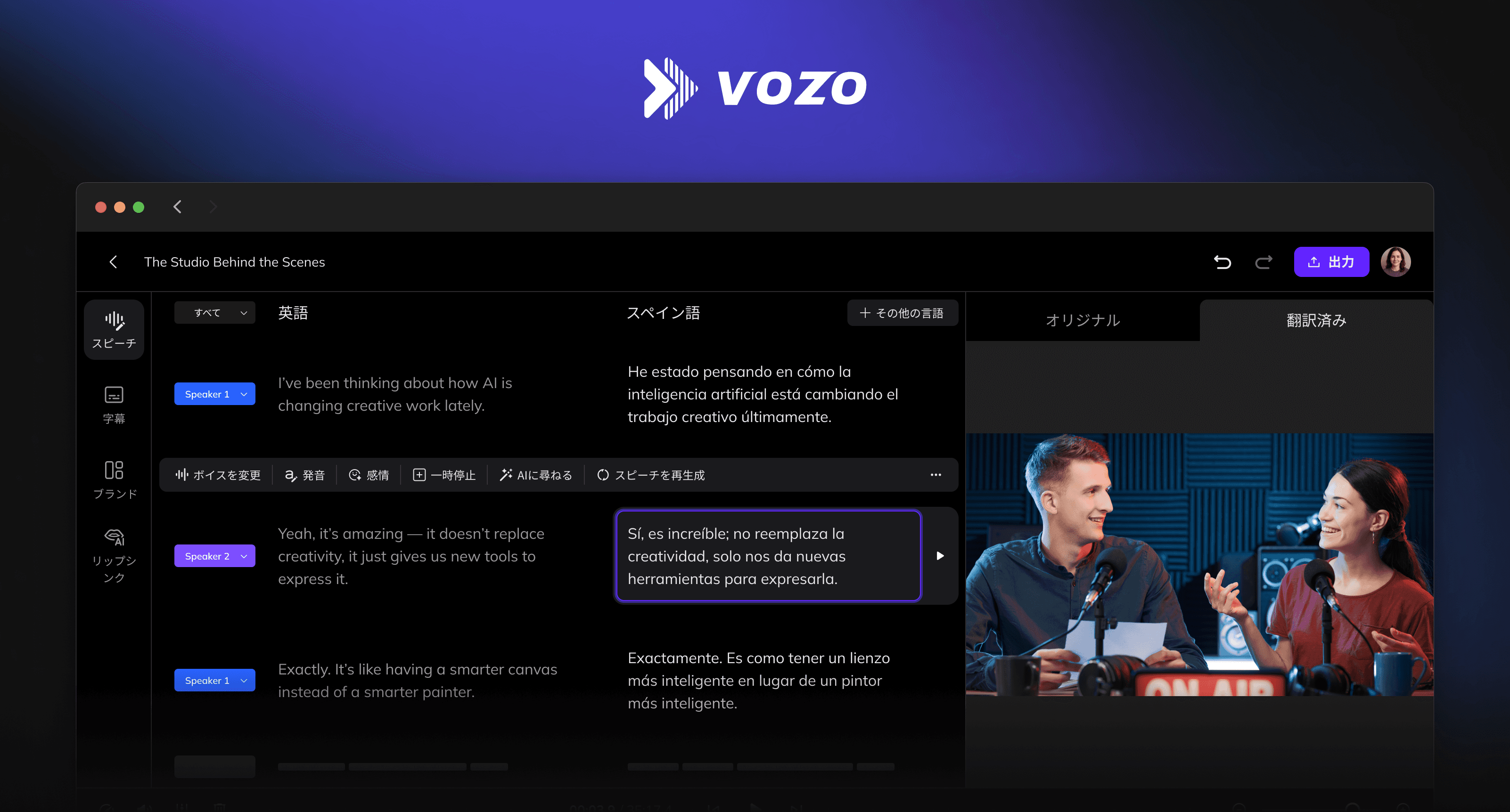 日本語特有の課題(早口、あいまいさ、敬語の複雑さ、情報の密度)に対し、VozoのAI翻訳エンジンと編集ツールは、これらをスムーズに処理できるよう特別に設計されています。