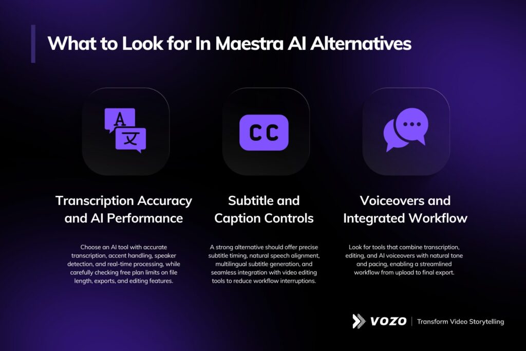 Vozo AI is the strongest Maestra AI alternative for creators who prioritize dubbed video quality over live transcription. Both platforms handle translation, subtitle generation and basic transcription.