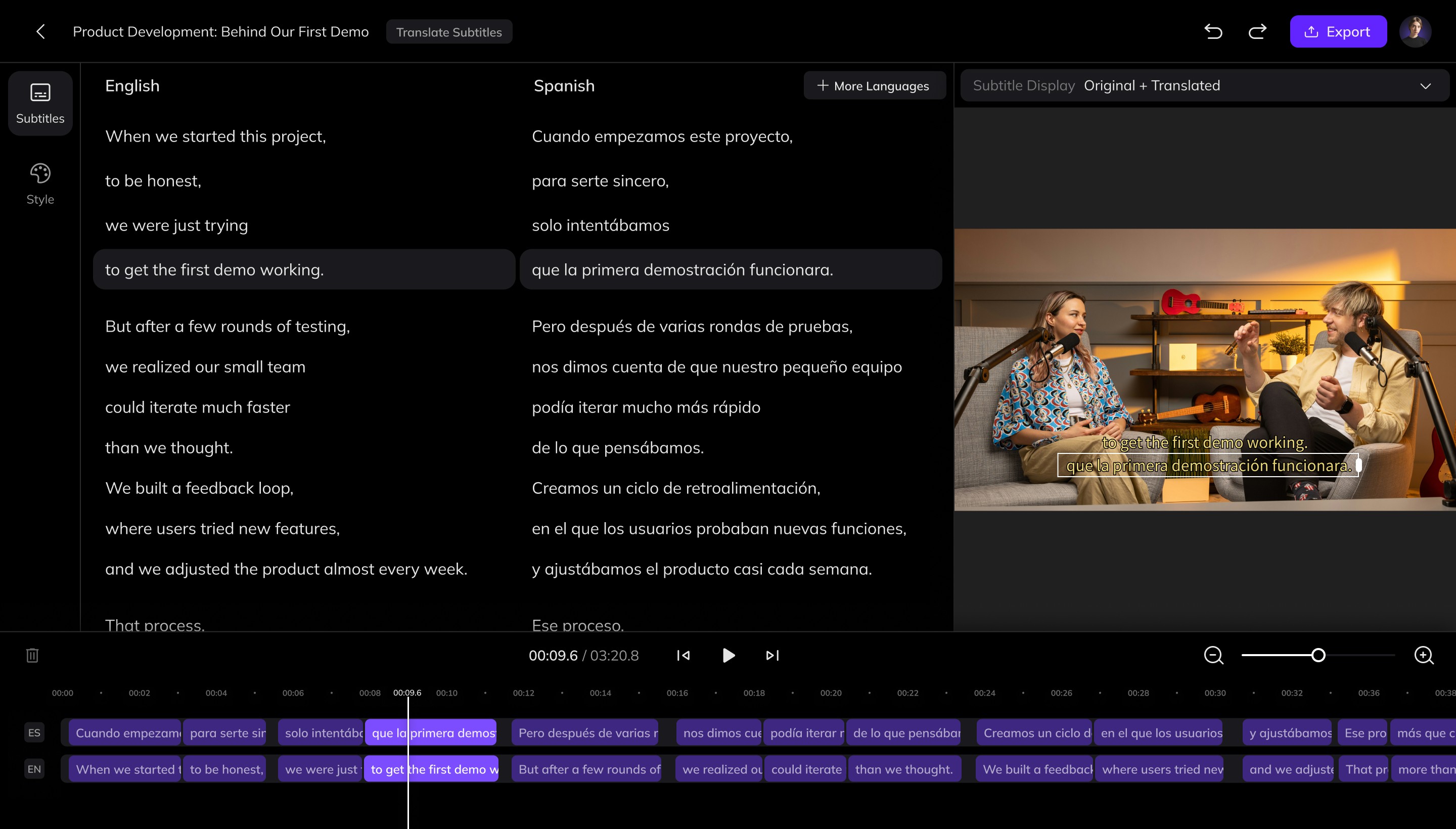 With bilingual subtitles enabled, timing stays aligned even when different languages require different segment breaks — for example, one language may be split into two subtitle segments while another remains as one.