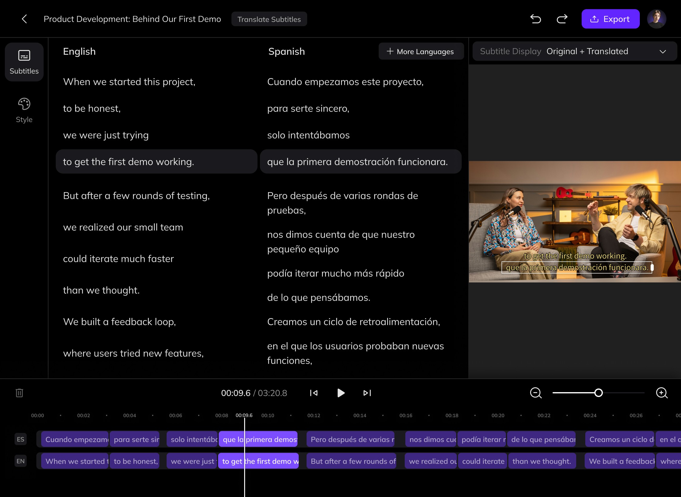 AI handles the full subtitle translation process for you, while you stay in one editor to review and refine anything.