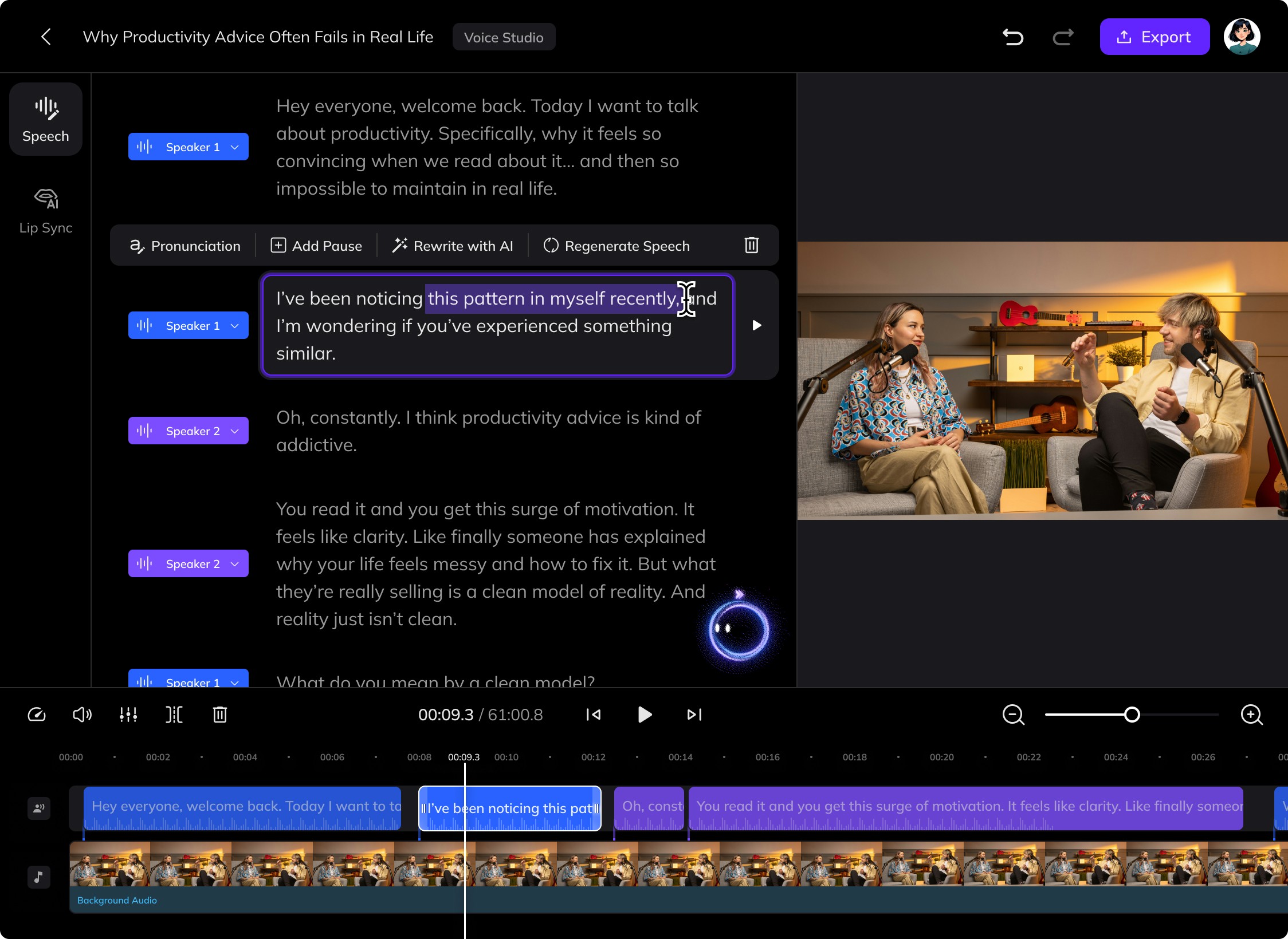 Auto-clone each speaker’s voice from your uploaded audio or video and use it to edit speech or generate new speech.